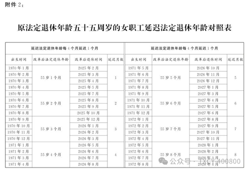 2.原法定退休年齡五十五周歲的女職工延遲法定退休年齡對照表